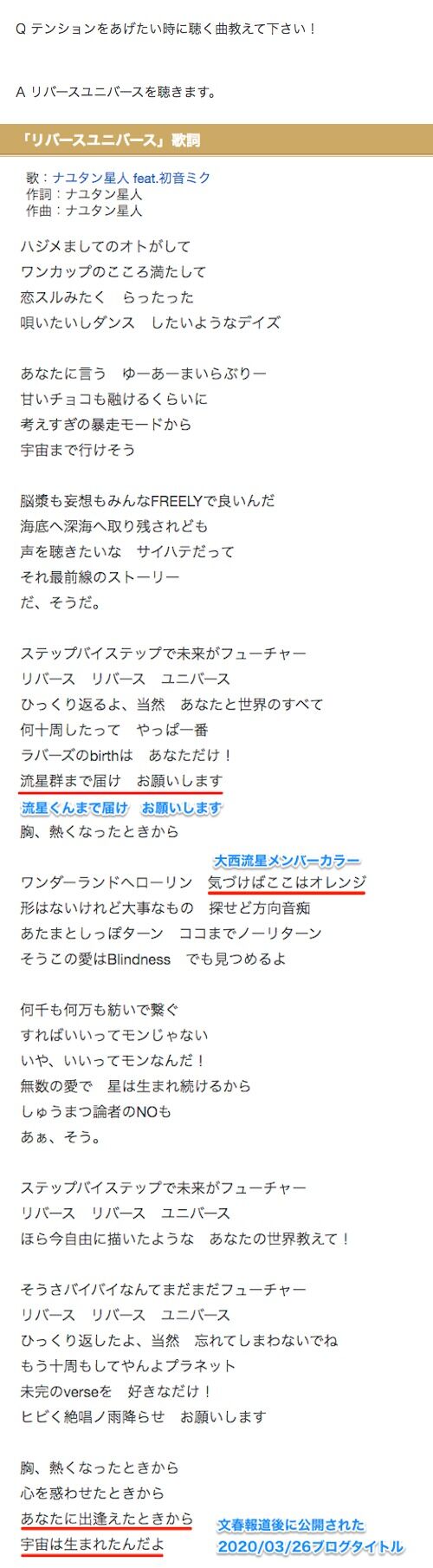 2020/07/13ブログ なにわ男子の自己紹介ラップ「7stars」大西流星パートのフレーズが含まれる質問を採用