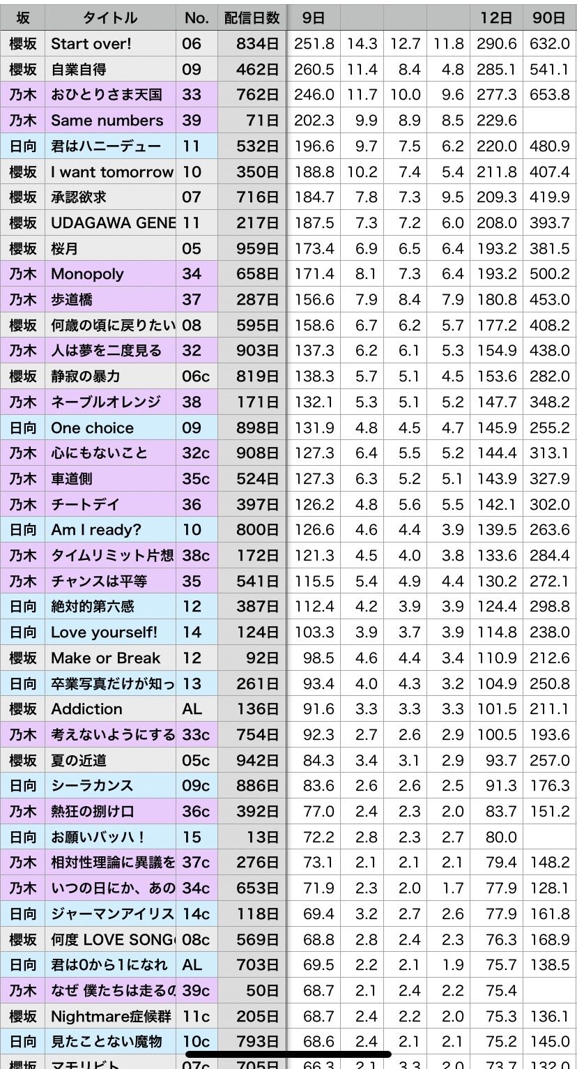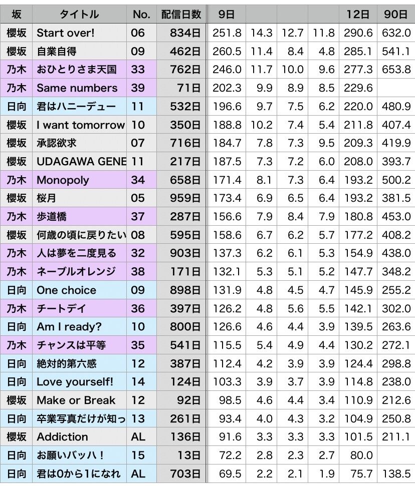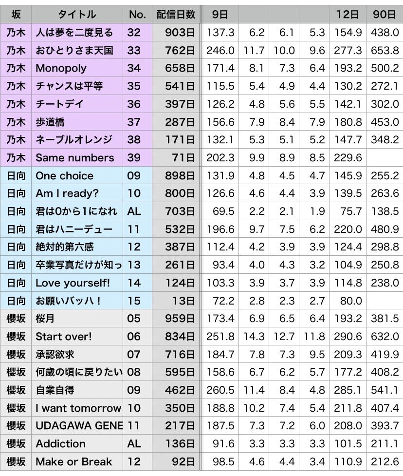 (乃木坂が歩道橋から持ち直し、日向坂が卒業写真から落ちたので直近3曲で区切るとこうなる)