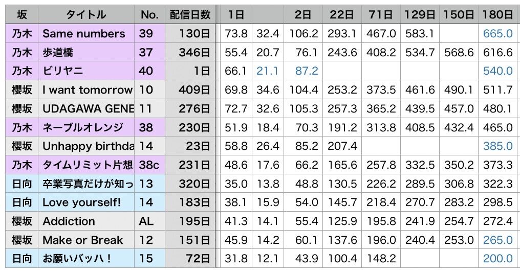 坂道のMV再生回数(IWTC以降、180日目順、青字は推定値)